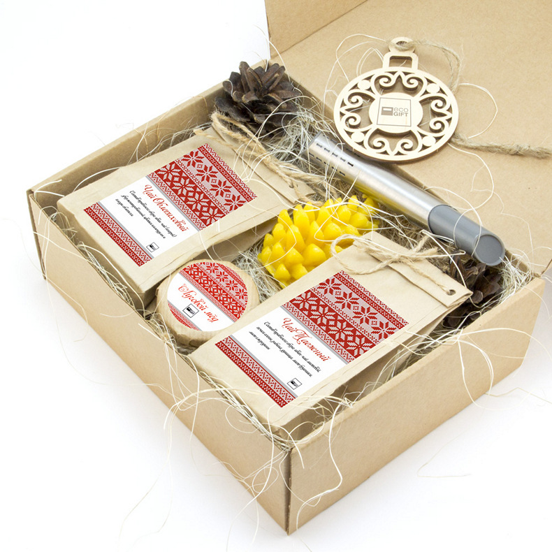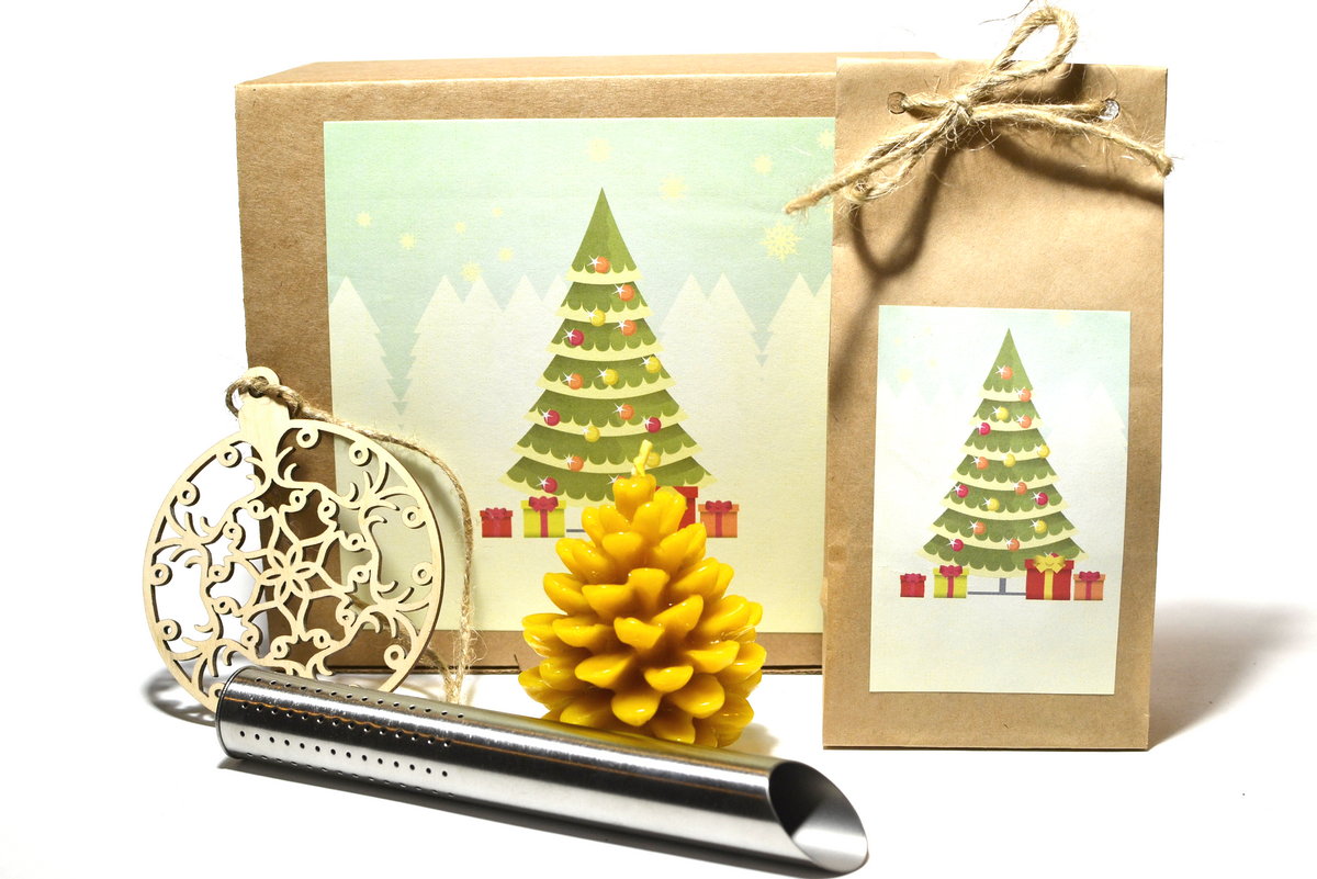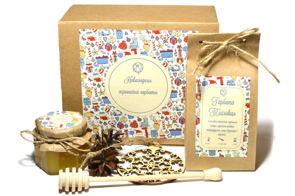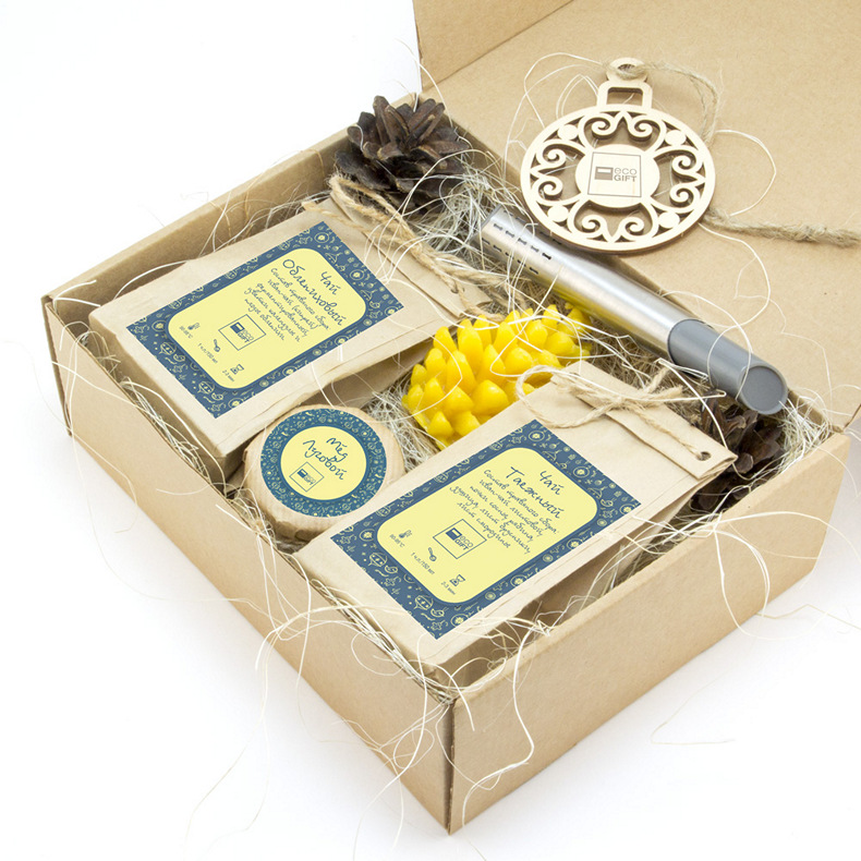 2 травяных чая по 50 г, баночка лугового мёда — 125 г, металлический тубус-заварник для чая с гравировкой логотипа, деревянная ложка для меда, свеча из натурального пчелиного воска в виде кедровой шишки, елочная игрушка из дерева, 1 сосновая шишка.