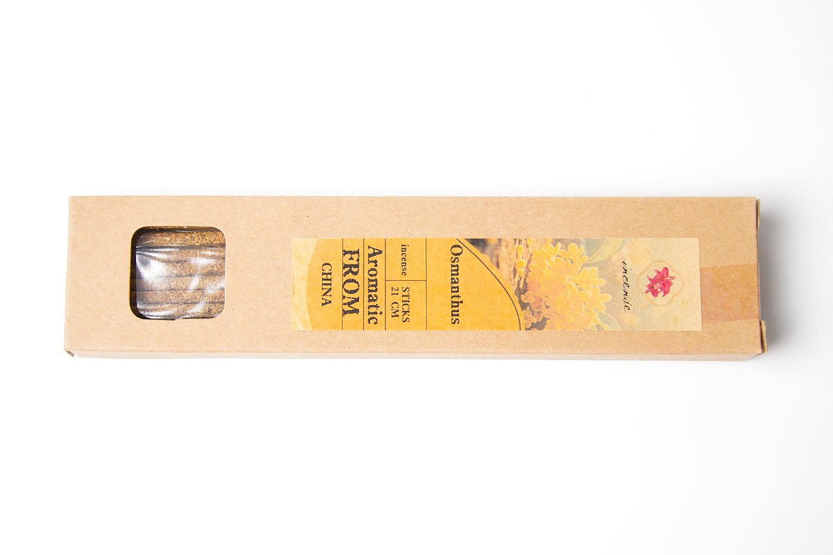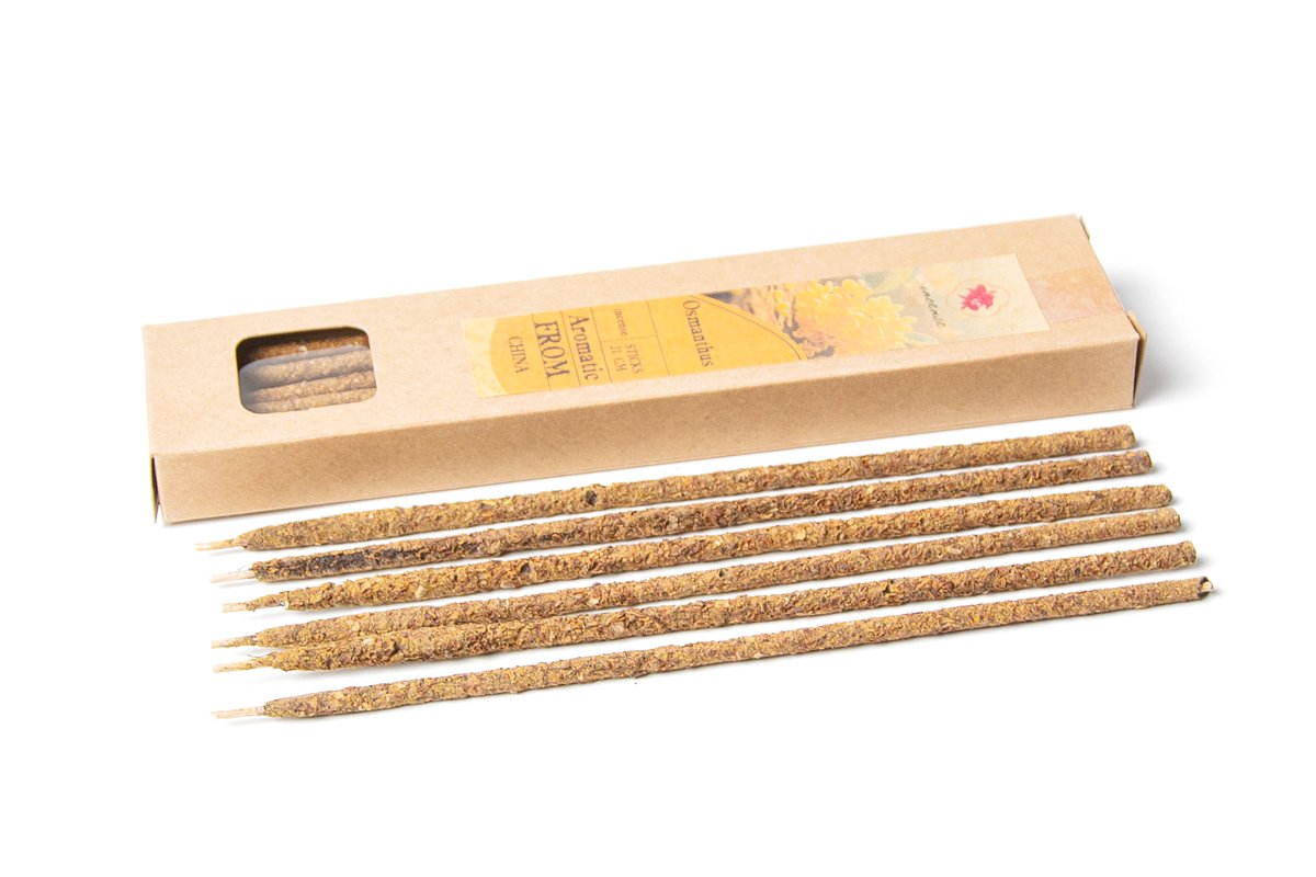 Яркие и оригинальные китайские благовония с османтусом в виде палочек. Бамбуковая основа, на которой крепится смесь из крупно смолотой фракции цветков все того же османтуса и древесных смол в качестве клейкой основы. Аромат благовоний яркий, выразительный, насыщенный и многогранный.