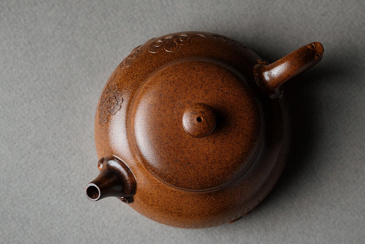 Глиняный исинский чайник имеющий отсылки к форме Лундай Ху (Драконий Пояс). Внешние стороны посуды украшены красивой, фактурной резьбой, а верх покрыт тончайшим слоем глянцевой глазури. Этот тандем создает поистине великолепный внешний вид чайника, которым хочется любоваться, вглядываясь в каждую мелочь.