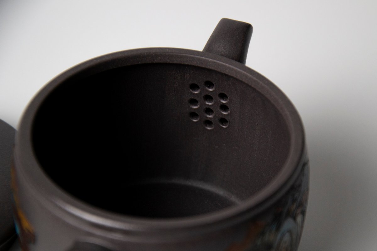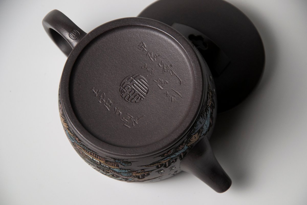 Оригинальный чайник из исинской глины от мастера Ван Ся (王霞) в традиционной форме Хань Ва. Безупречное исполнение до мелочей. Прекрасная симметрия, притертость крышки к основанию, ровный и быстрый слив. Внешняя часть чайника украшена фактурной, резьбовой росписью с использованием специальных красок. Настоящее произведение искусства.