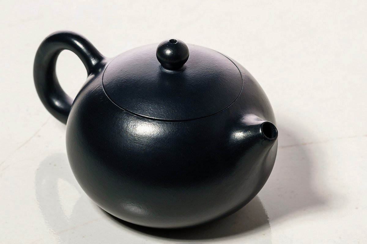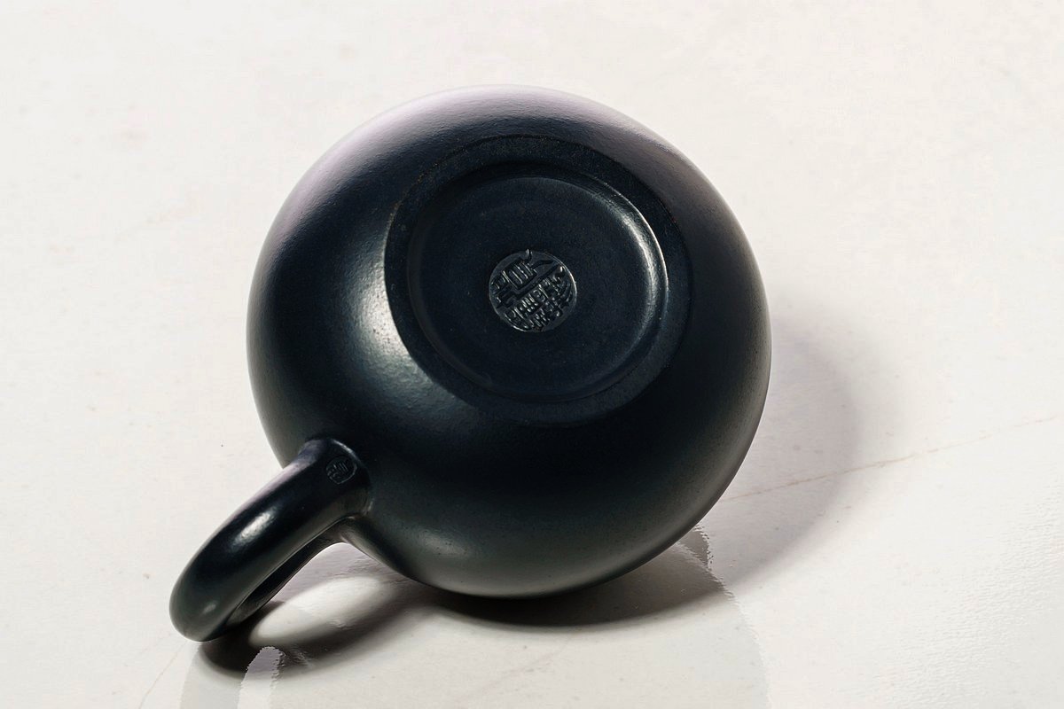 Чайник из комбинации двух исинских глин – Хэй Ни и Мо Люй Ни. В результате мы получили посуду с очень интересным цветом – темно-синего, с зеленоватым и черным отливом. Шикарная работа мастера Чжу Тайсяна (朱太祥), выполненная в классической форме Си Ши. Прекрасная симметрия и геометрия, идеально притертая крышка, безупречно работающий водяной замок и быстрый слив около 10 сек. Сливное сито плоское, типа пин кун с 9-ю отверстиями.