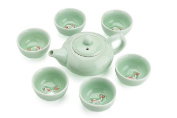 Чайный сервиз “Карпы”, 7 предметовКерамический чайный сервиз из 7 предметов: чайник и 6 пиал. Объем чайника ~130мл, пиалки по ~30-35мл. Красивая, глянцевая глазурь и милые, фактурные рыбки на дне каждой чашки. Пользоваться одно удовольствие. А дарить любителям чая – еще большее.