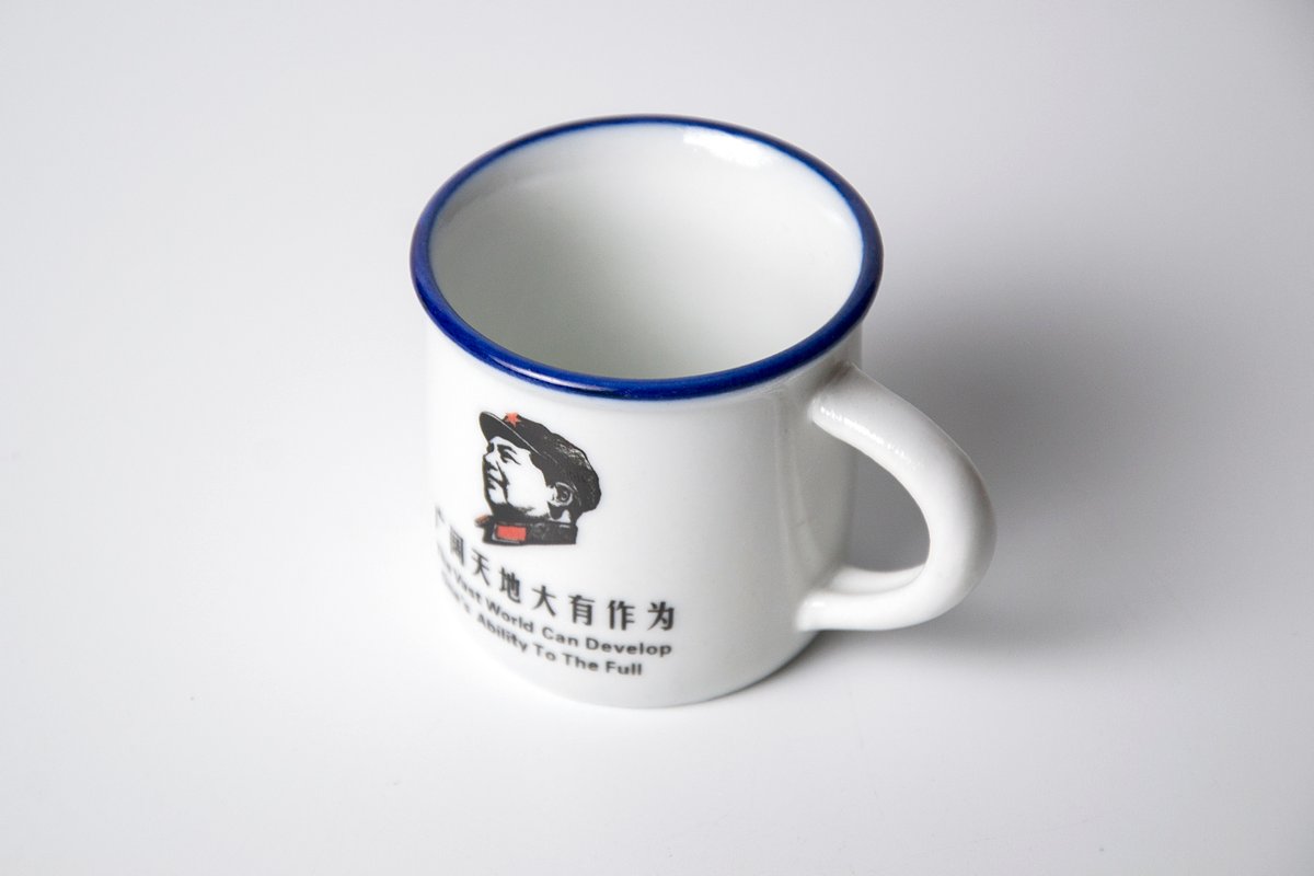 Небольшая фарфоровая чашка-куржка, облитая поверх глянцевой глазурью. На внешней стороне декорирована изображением Мао Цзедуна и его одним из лозунгов. Чашка имеет среднюю толщину стенок и вытянутую вверх форму, что позволяет дольше сохранять тепло чая.