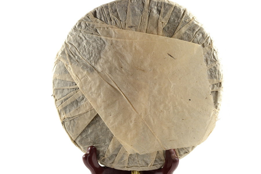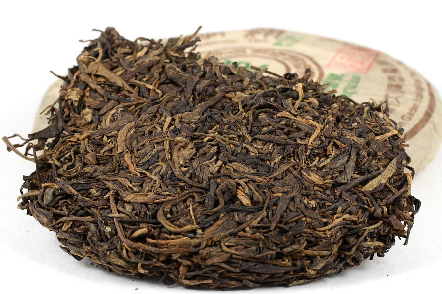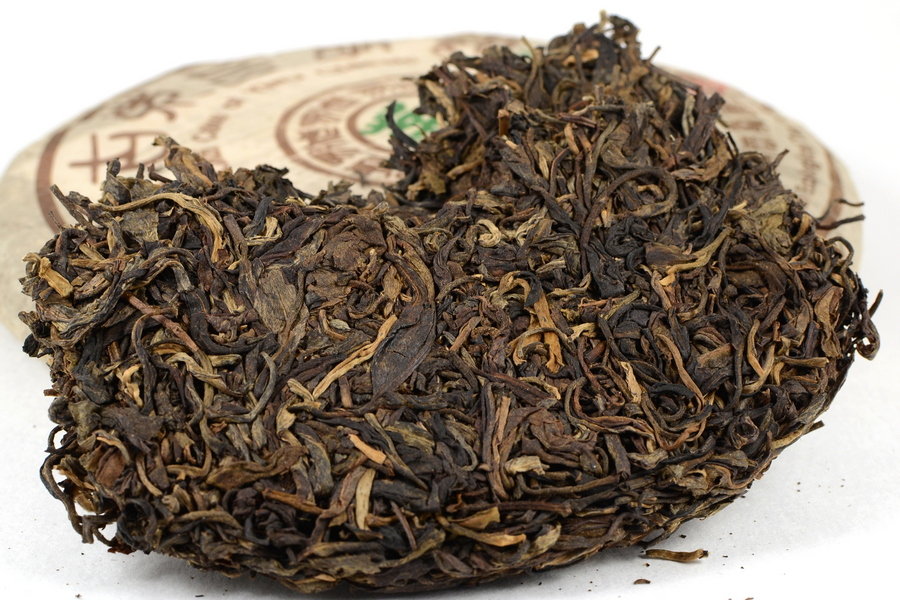 Внешний вид – круглая лепешка весом 400 гр., рыхлая, фактурная. Прессовка мягкая, каменная. Легко расслаивается пуэрным ножом и разбирается руками на небольшие жгутики буро-коричневого цвета с золотистыми вкраплениями. Аромат сухого чая сухой, сдержанный, «полежавший», с тонкими нюансами древесины, специй и сухофруктов.