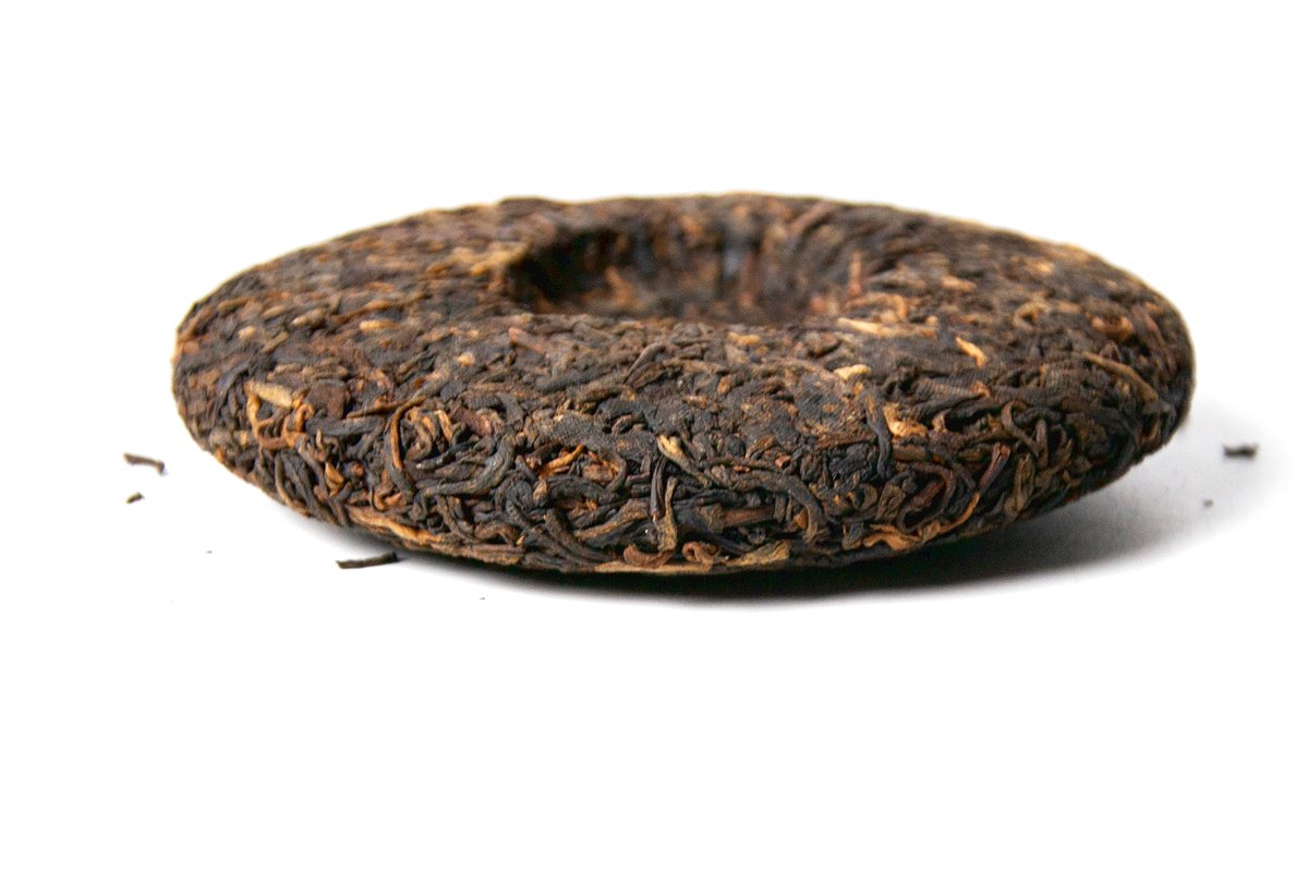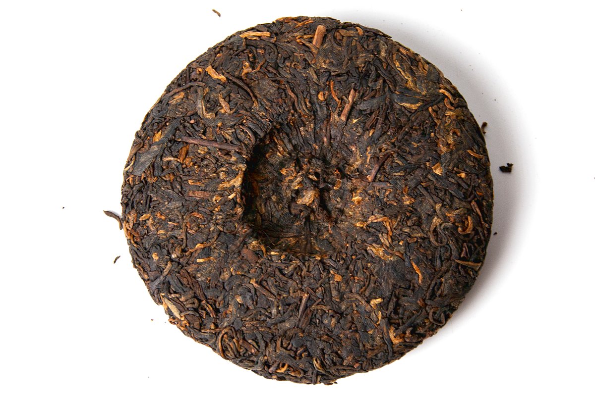 Аккуратный, маленький блинчик, весом 100 гр. с умеренно мягкой прессовкой. На разломе сырье аккуратное и чистое, состоящее из крупных, мясистых листьев, обилия почек и небольшого количества черенков. Аромат сухого чая выразительный, мягкий, благородный, древесно-пряный, с ореховыми оттенками.