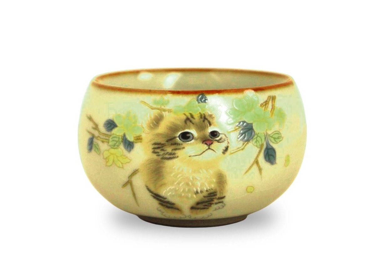 Керамическая пиала с рисунком милого котёнка. Широкая форма хорошо и быстро остужает чай, подойдёт для темных чаев. Объем чашки — 75 мл.