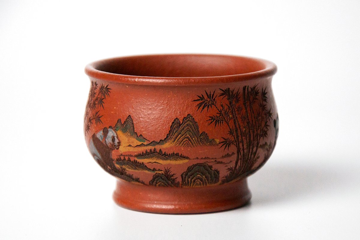 Очаровывающая и влюбляющая с первого взгляда пиала из исинской глины Цин Шуй Ни в безупречном своем исполнении. Мастерское исполнение с невероятной, фактурной росписью в виде пейзажа с бамбуком и пандами. Большой объем, толстые стенки и удобная форма, которая идеально лежит в руке.