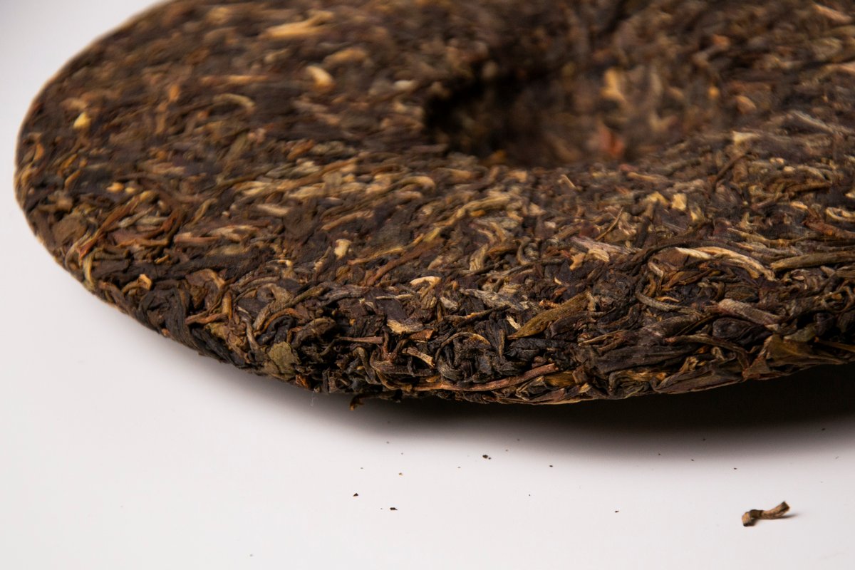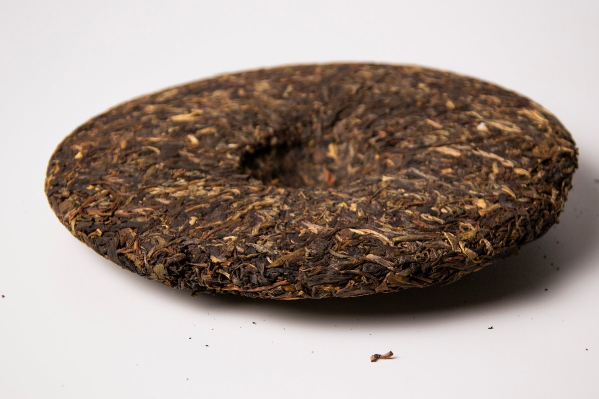 Классический блинчик, весом 357 гр. имеет достаточно плотную прессовку, для разделки которой лучше всего подойдет пуэрный нож или шило. На разломе сырье чистое и красивое, без посторонних предметов, пыли и мелкой сырьевой фракции. Аромат сухого чая яркий, выразительный и приятный, пряно-цветочный, с легкими дымными, древесными и смолистыми нюансами.
